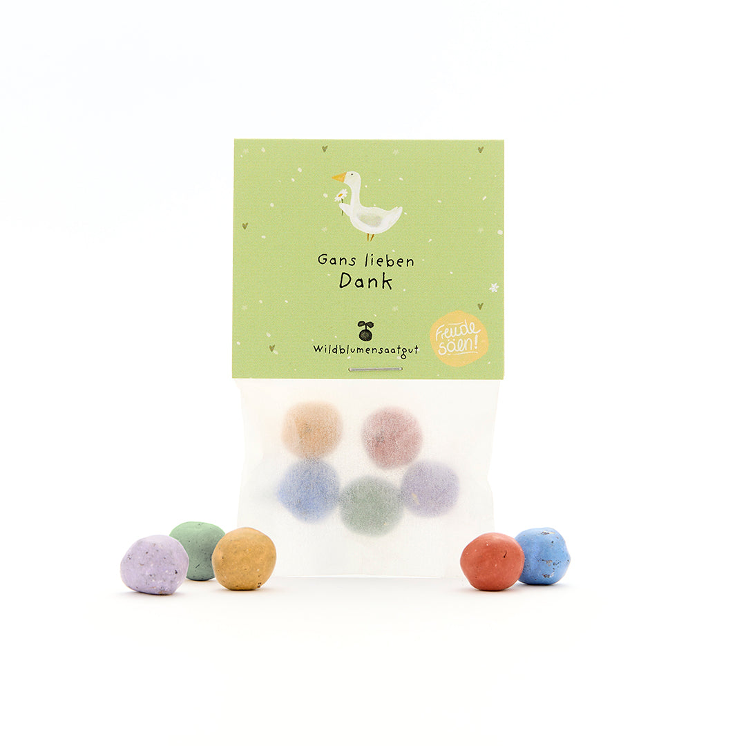 Nachhaltig schenken mit Humor: Die Samenbomben lassen bunte Blumen wachsen – ganz ohne Plastik oder Müll. Einfach auswerfen, gießen und gemeinsam mit der Gans über die Blüten freuen. Ein umweltfreundlicher Gruß, der lange in Erinnerung bleibt.