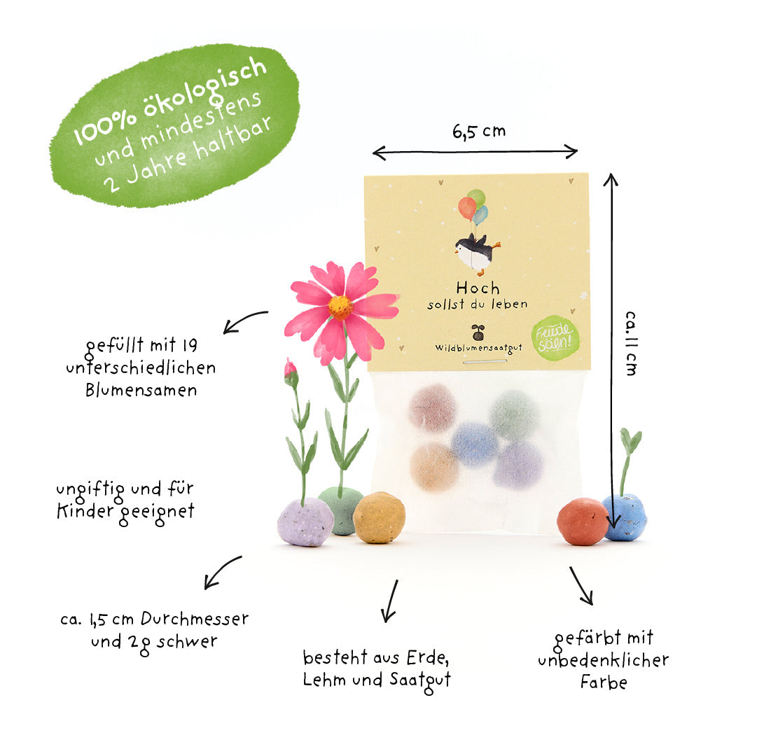 Blühendes Abenteuer für Geburtstagskinder: Einfach einpflanzen, gießen und staunen: Aus den farbenfrohen Saatkugeln wachsen heimische Wildblumen – ein spannendes Naturerlebnis für große und kleine Geburtstagskinder, das auch nach dem Fest noch begeistert.