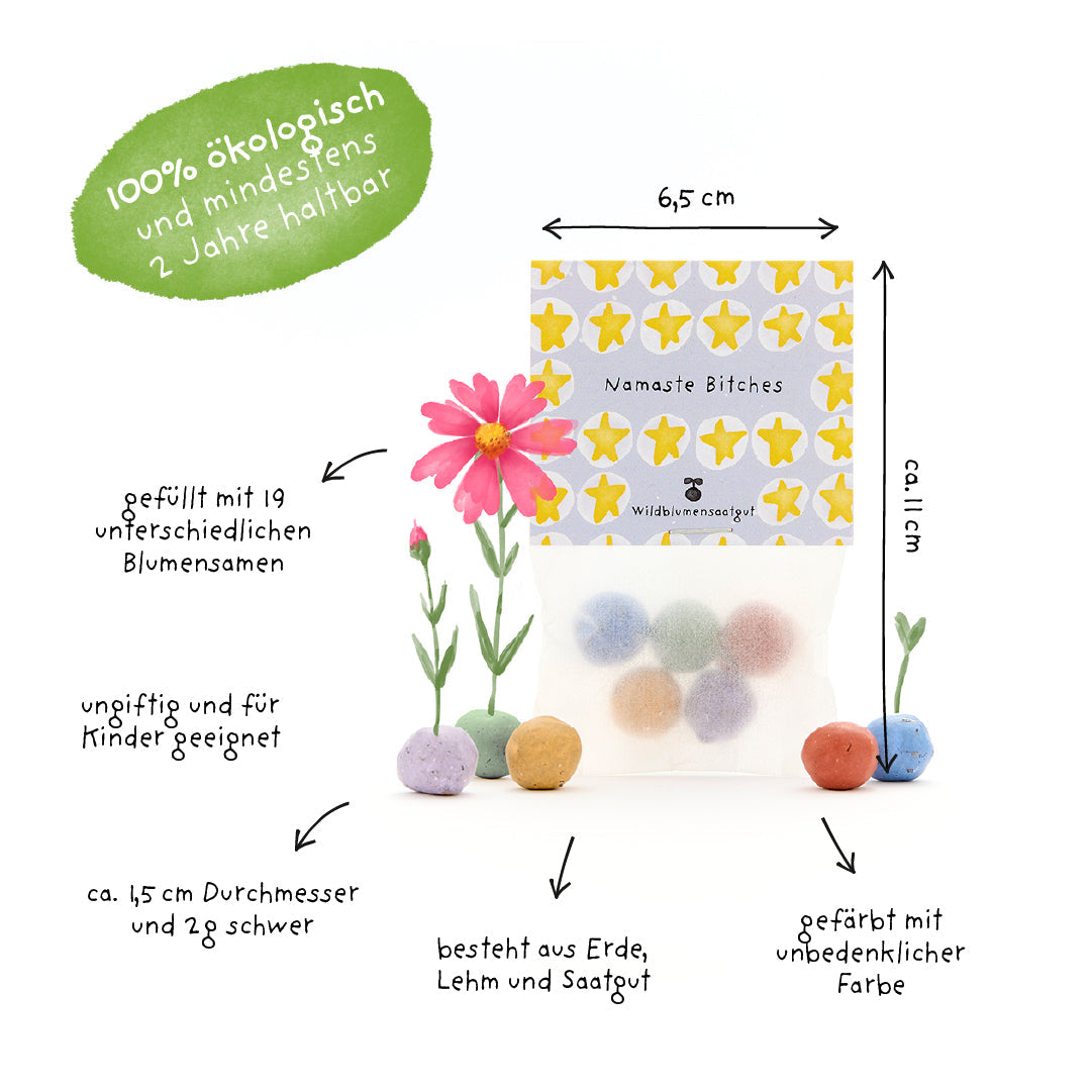 Frecher Blumengruß mit Zen: Dieses Set enthält ein liebevoll gestaltete Tütchen mit 5 bunten Blumenmurmeln. Mit der Aufschrift „Namaste Bitches“ ist jedes Beutelchen ein augenzwinkernder Mix aus Achtsamkeit und Attitude – ideal für Menschen mit Humor und Herz.