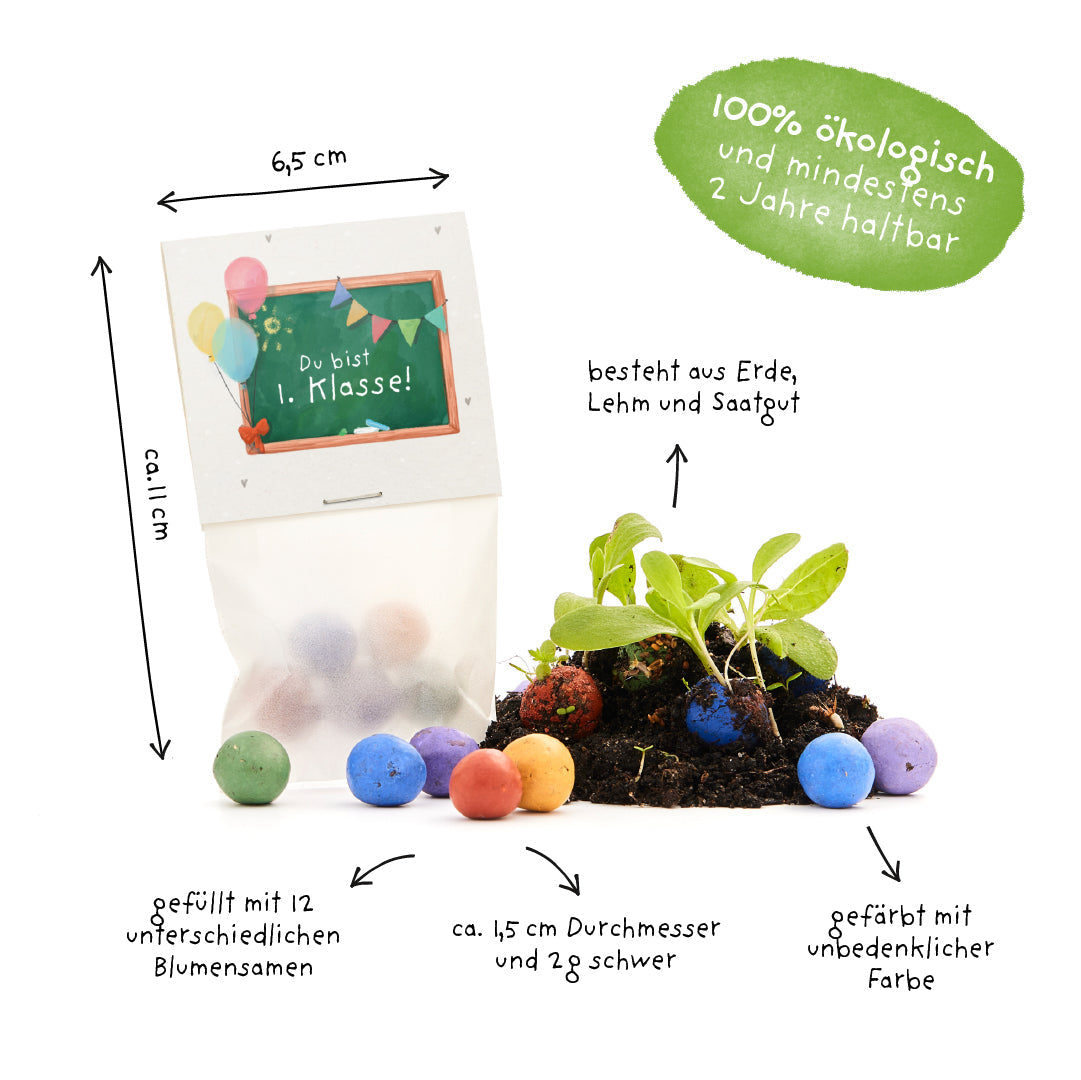 Nachhaltig & kindgerecht: Die bunten Saatkugeln bestehen aus natürlichen Materialien, sind plastikfrei verpackt und mind. 2 Jahre haltbar. Ein Geschenk zur Schuleinführung, das Freude macht & der Umwelt guttut.