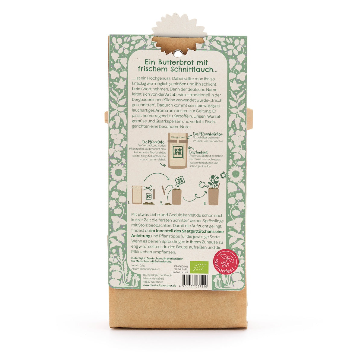 Alles-in-einem Anzuchtset: Enthält keimfreudiges BIO-Saatgut für Schnittlauch, beste Anzuchterde, ein passendes Pflanzstäbchen bzw. Beetmarkierer und eine wasserfeste Verpackung, die als Pflanzgefäß genutzt wird. Mit der ausführlichen und anfängerfreundlichen Anleitung funktioniert die Anzucht kinderleicht!