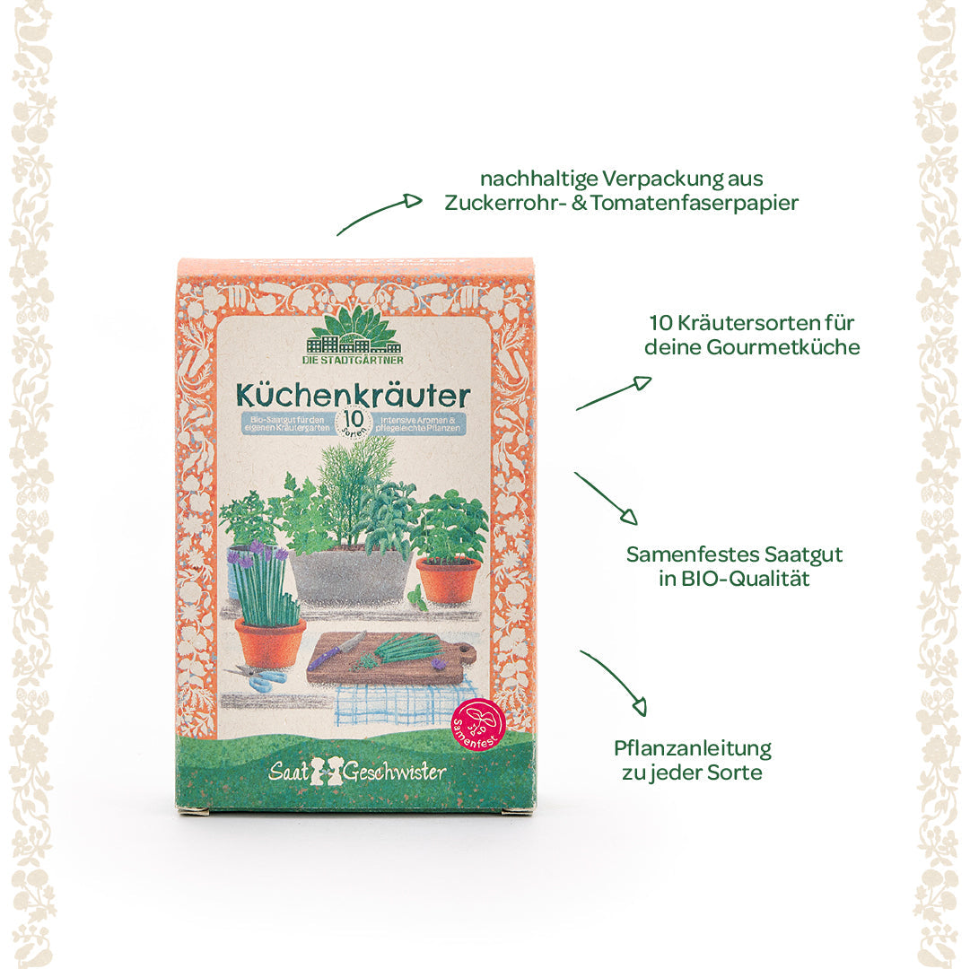 HOCHWERTIG: Für unser Küchenkräuter Saatgut-Set verwenden wir ausschließlich hochwertiges Saatgut in BIO-Qualität. Die Verpackung besteht aus nachhaltigem Zuckerrohrpapier. Sie sieht nicht nur toll aus, sondern eignet sich auch optimal zur Aufbewahrung des Saatguts.