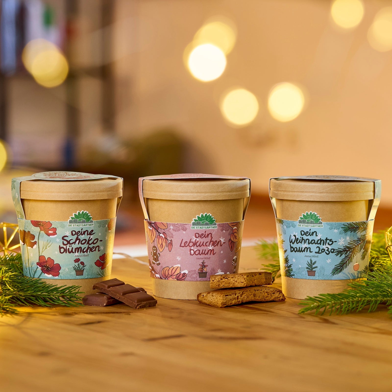 Spar-Set: 3 weihnachtliche Anzuchtsets für Schokoblumen, Lebkuchen- und Weihnachtsbäume. Dieses niedlichen Anzuchtsets enthalten alles, was du zur Anzucht brauchst: Pflanzbecher, Saatgut, Quelltabletten und ausführliche Anleitungen.