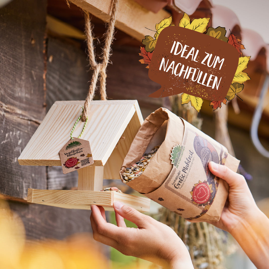 Eine große Portion (1 Liter) hochwertiges Wildvögelfutter für unsere gefiederten Freunde. Einfach in einer Schale servieren oder direkt im Vogelhäuschen kredenzen.