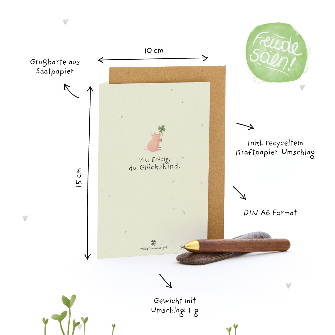 Ein Wunsch, der Wurzeln schlägt: Aus dem Saatpapier mit Widblumensamen sprießen schon bald Klatschmohn, Gänseblümchen und Vergissmeinnicht. So blüht deine Botschaft im wahrsten Sinne des Wortes und bleibt nicht nur im Kopf, sondern auch im Garten in Erinnerung. Schöner kann man nicht "Viel Erfolg" wünschen.
