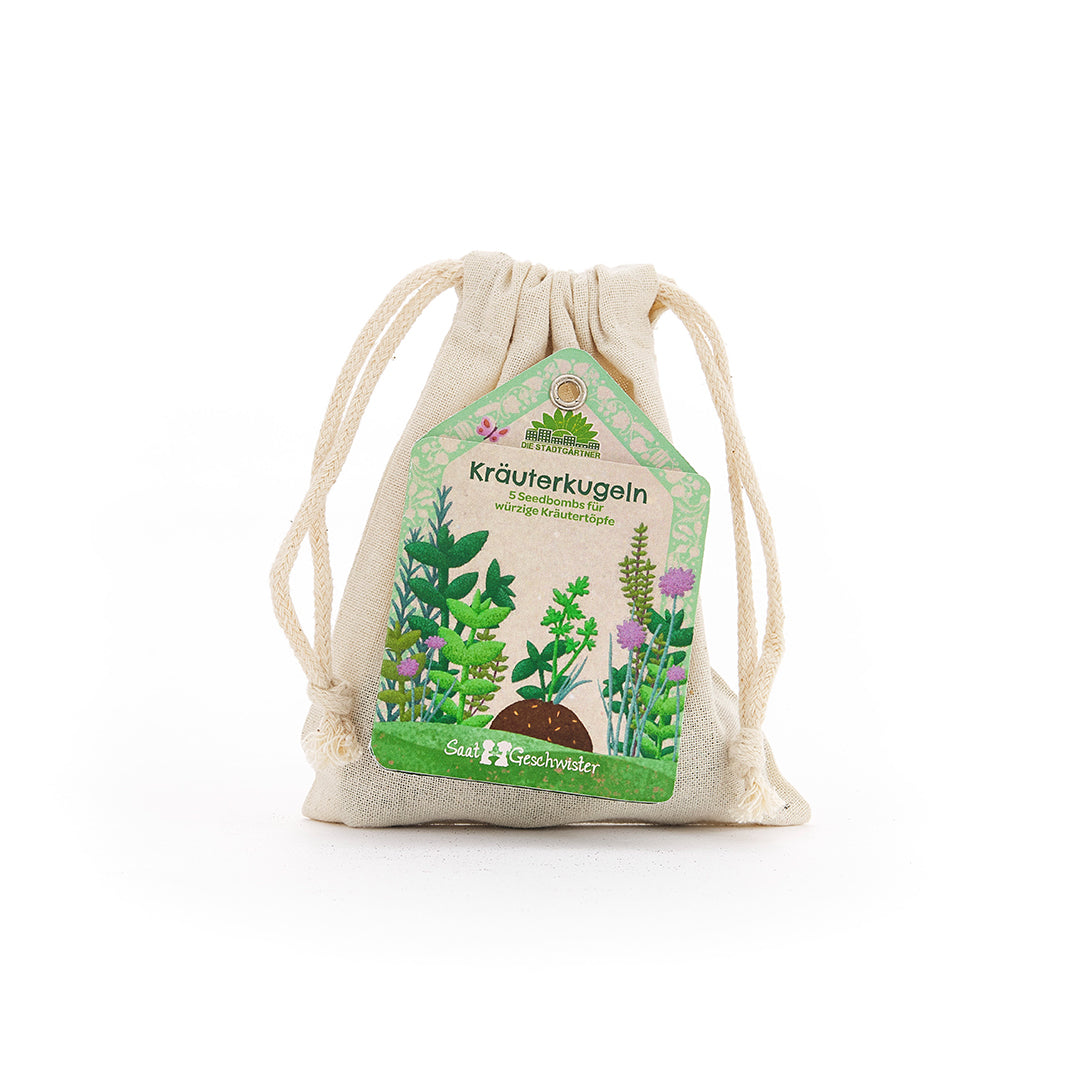 Nachhaltig: Die Saatkugeln werden einfach auf lockere Erde gelegt und regelmäßig gegossen – schon bald sprießen frische Kräuter. Das Säckchen besteht aus nachhaltiger, GOTS-zertifizierter Baumwolle und kann wunderbar wiederverwendet werden.