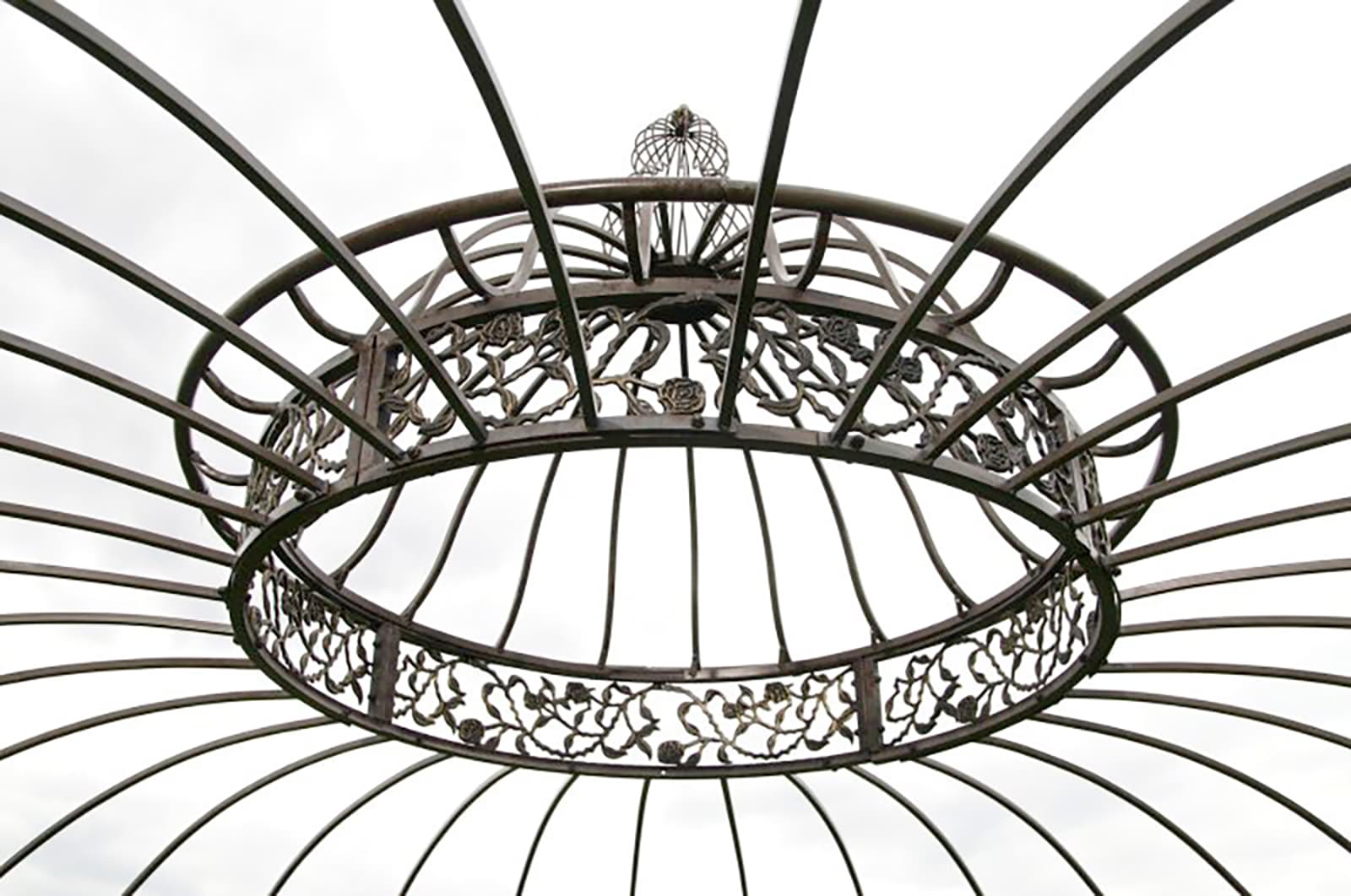 Und nicht nur das, mit diesem Pavillon werten Sie Ihr gesamtes Grundstück auf und zwar auf die charmanteste Weise, die man sich nur vorstellen kann! Er ist freistehend als auch mit Rankpflanzen bewachsen ein absolut exklusives Highlight, um Ihren Garten herausragend schön zu gestalten. Der großzügige Pavillon mit dem wunderschön verzierten und handgeschmiedeten Dach aus harmonisch geschwungenen Streben und einem Ausbrennermotiv in Form von Rosenranken und seitlichen 97 cm hohen Seitenwänden lässt keinerlei Wünsche offen! Das beeindruckende Dach wird von acht stabilen Rohren getragen, die in versetzter Optik durch künstlerisch gestaltete Streben und Muster verbunden sind. Auf diese elegante Weise bleibt der offene Charakter des Pavillons erhalten, während zugleich ein geschützter Raum für Ihre stilvolle Sitzgruppe geschaffen wird.