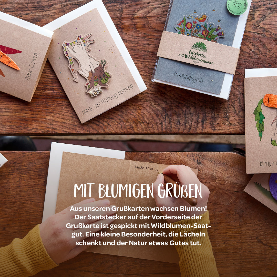 NACHHALTIG: Die umweltfreundliche Frühlings-Klappkarte bestehen aus 100 % PEFC-zertifiziertem Kraftpapier aus nachhaltig bewirtschafteten Wäldern. Das Saatgut ist mit unbedenklichem Bio-Klebstoff befestigt und trägt zur Förderung der Artenvielfalt bei.