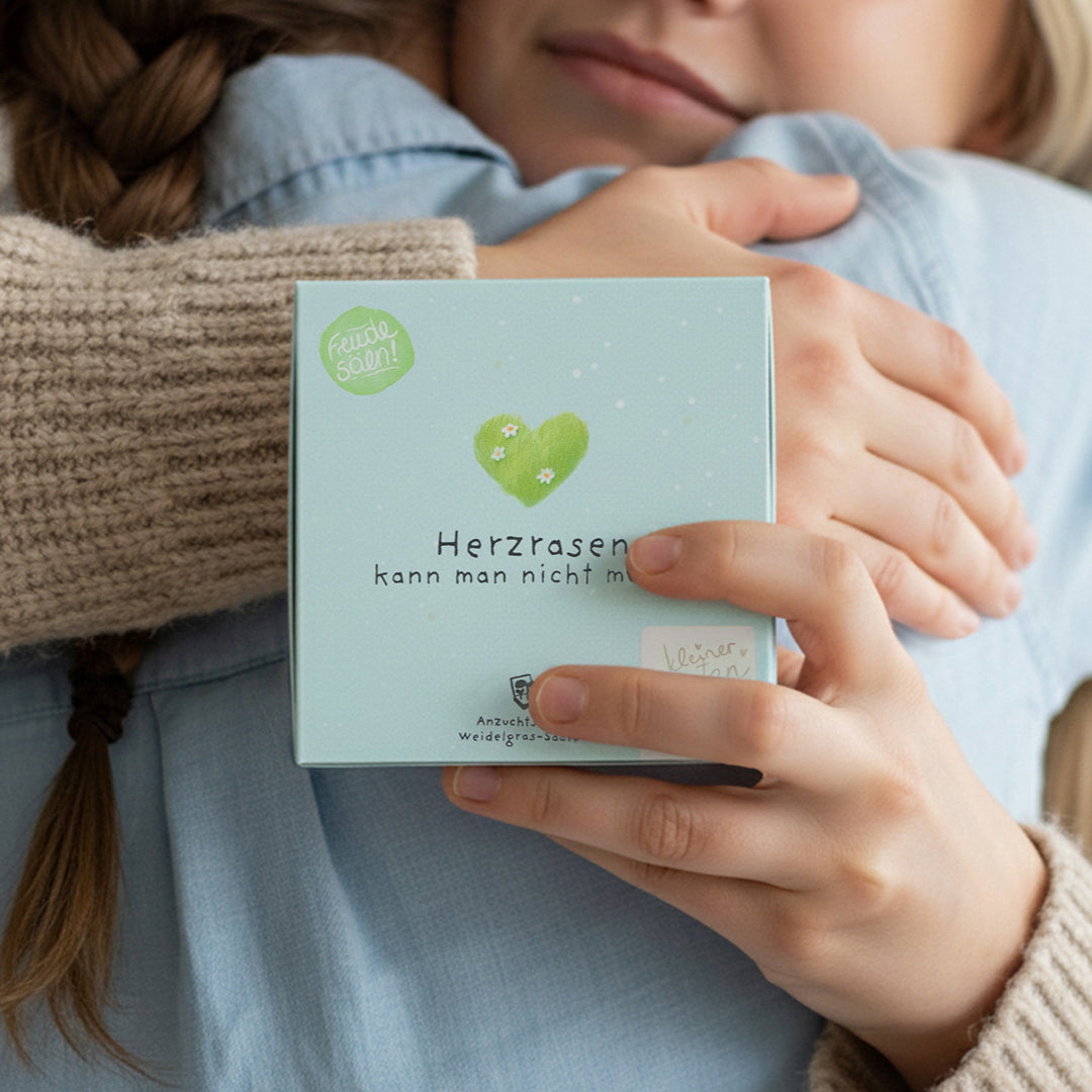 Ein Geschenk mit Herz: Ob zur Aufmunterung, zum Trösten oder als liebevolle Aufmerksamkeit unter Freundinnen - mit diesem Set sagst du auf besondere Weise: Ich seh dich. Ich denk an dich. Und alles wird wieder gut. Das enthaltene Weidelgras wächst schnell und kräftig - wie Gefühle, die Raum bekommen.