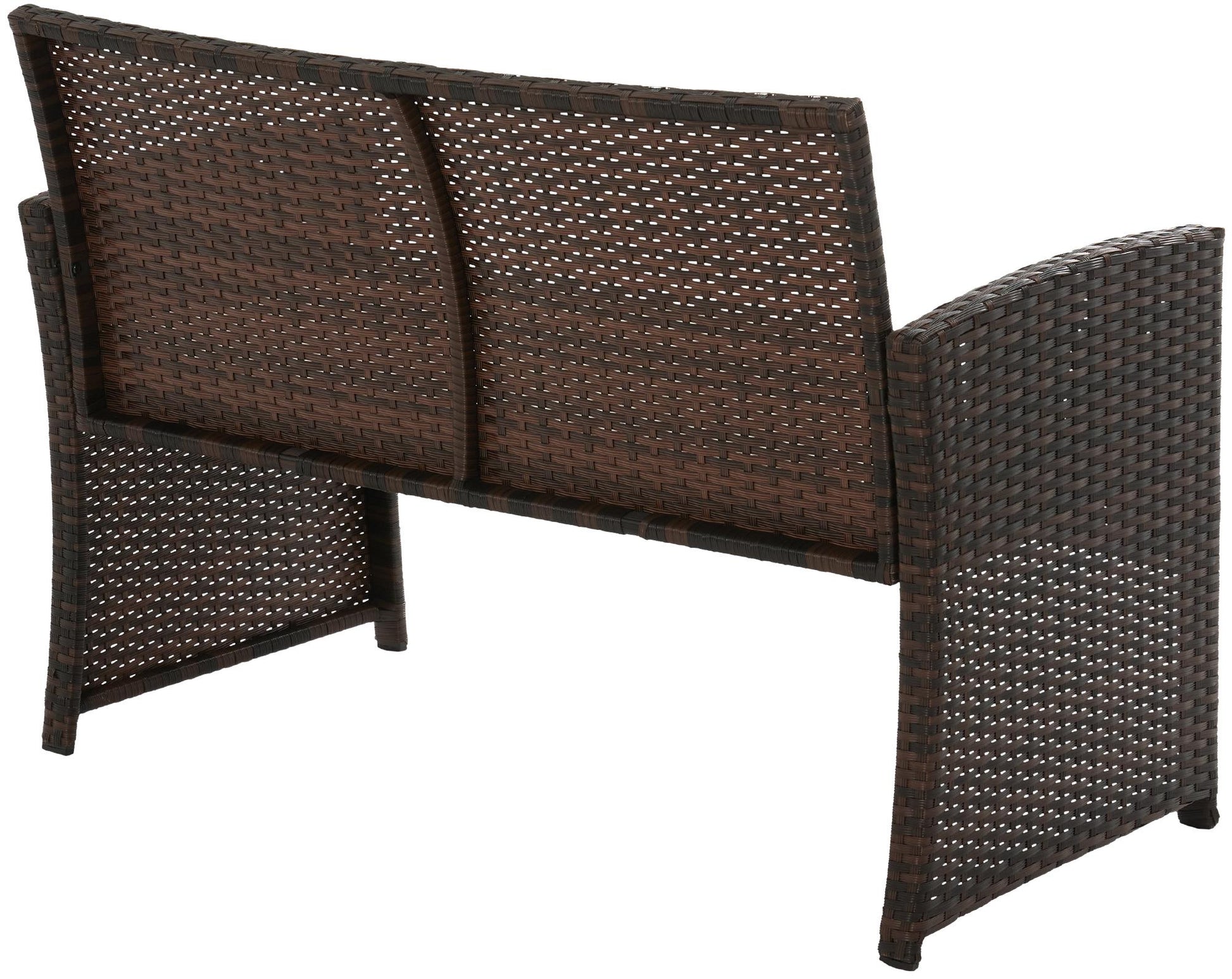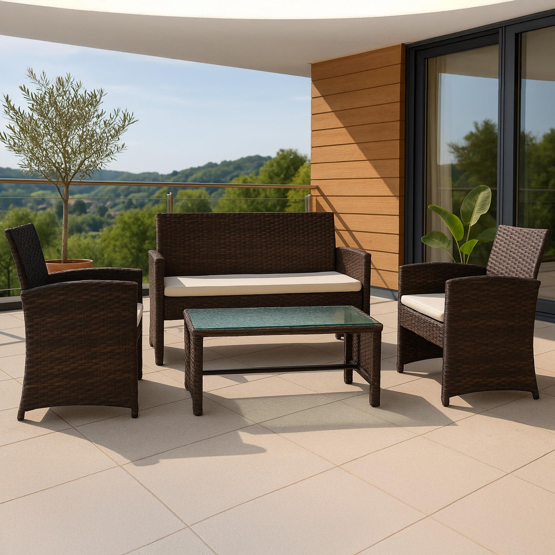 Die Gartenmöbelgarnitur besteht aus zwei Sesseln, einem Sofa für zwei Personen und einem Gartentisch mit einer Glasplatte. Bequeme Sitzpolster sind im Set ebenfalls enthalten und erhöhen den Sitzkomfort zusammen mit den Rückenlehnen.