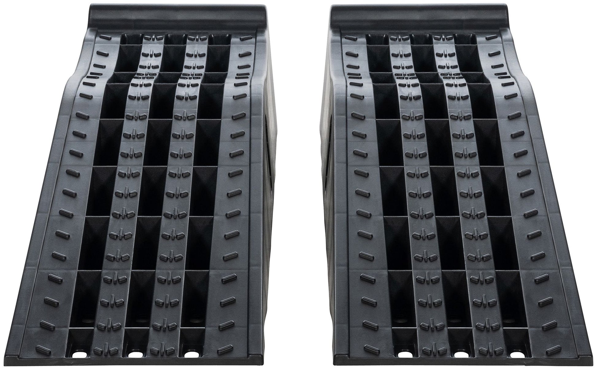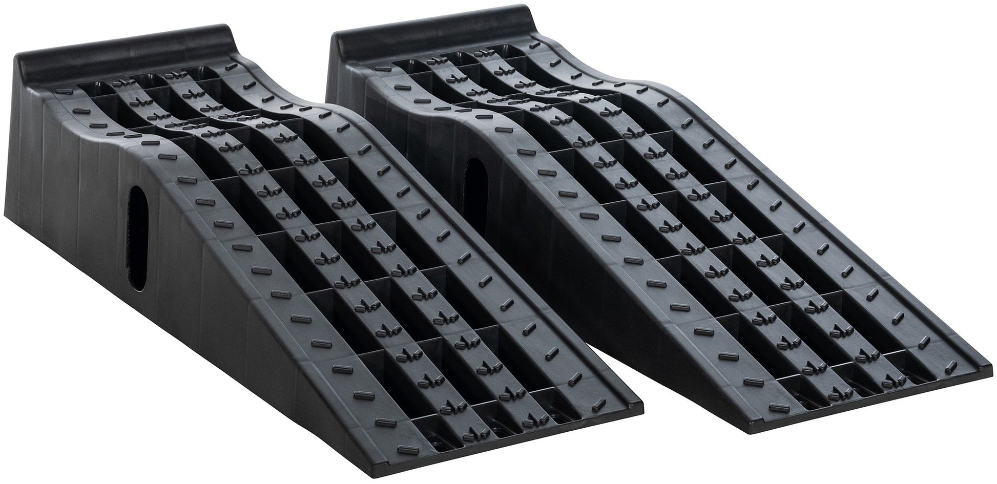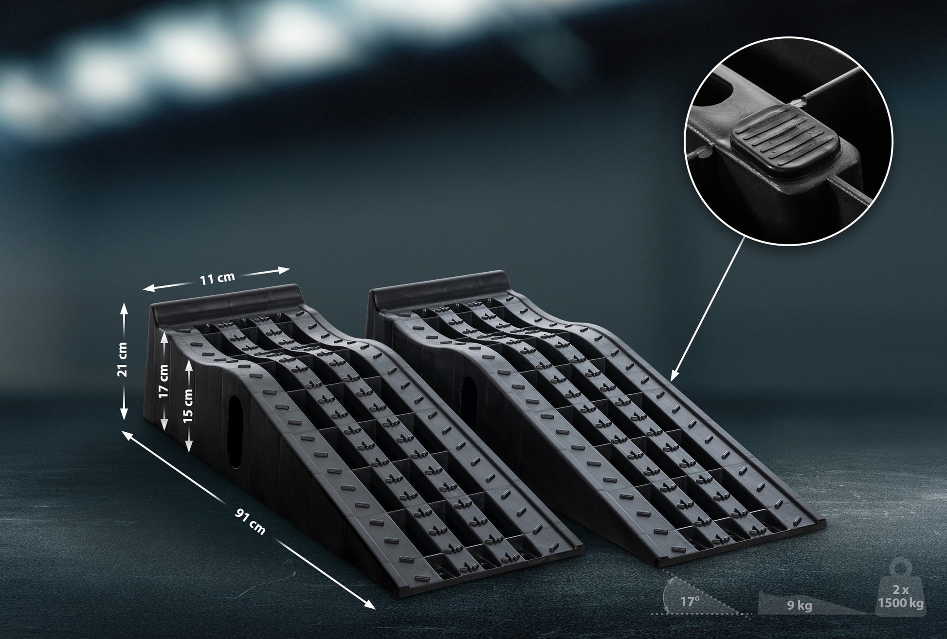 Set 1 umfasst zwei schwarze Auffahrböcke, um eine erhöhte Bodenfreiheit zu ermöglichen, ideal für Autobesitzer, die selbst Reparaturen und Wartungen vornehmen möchten.