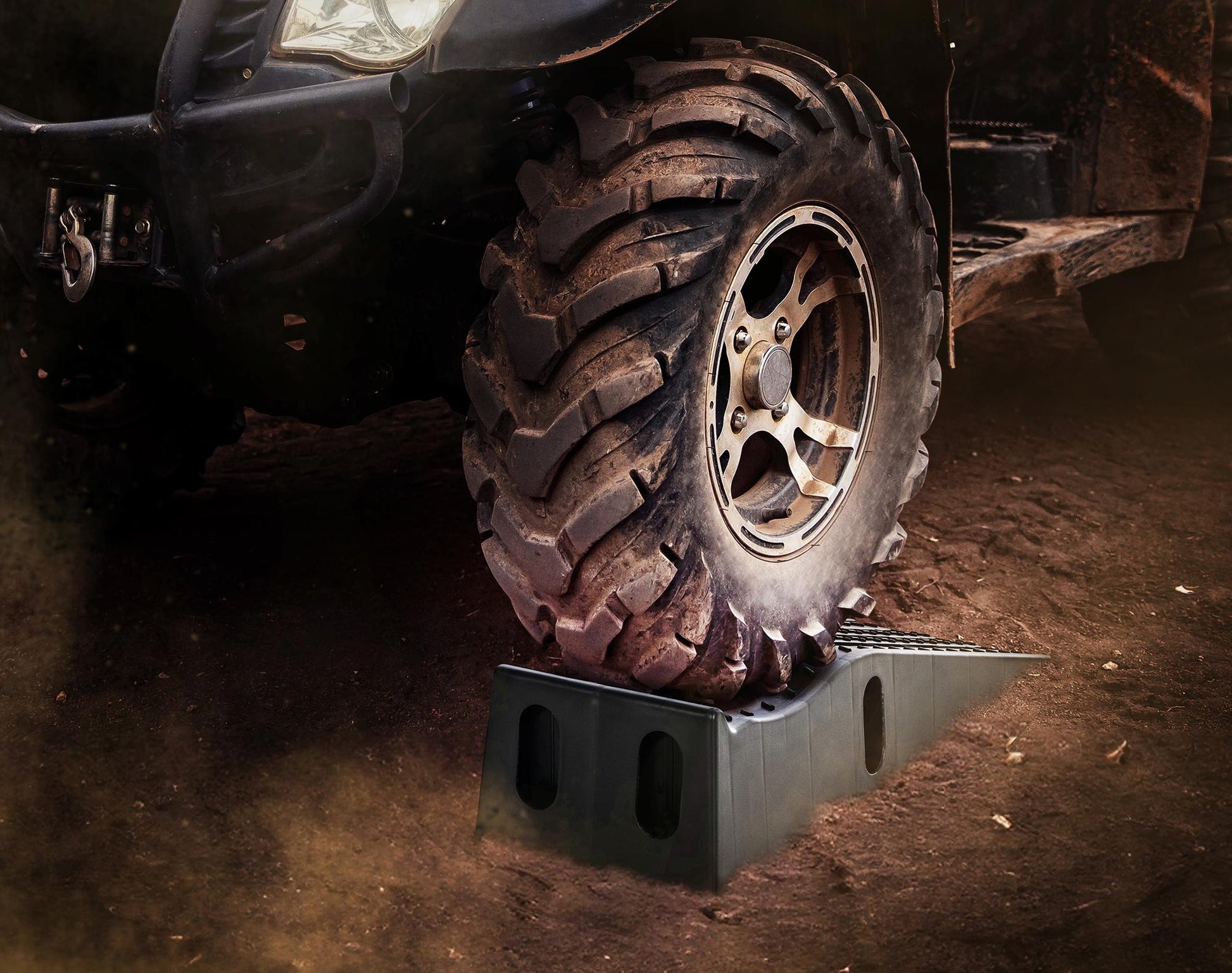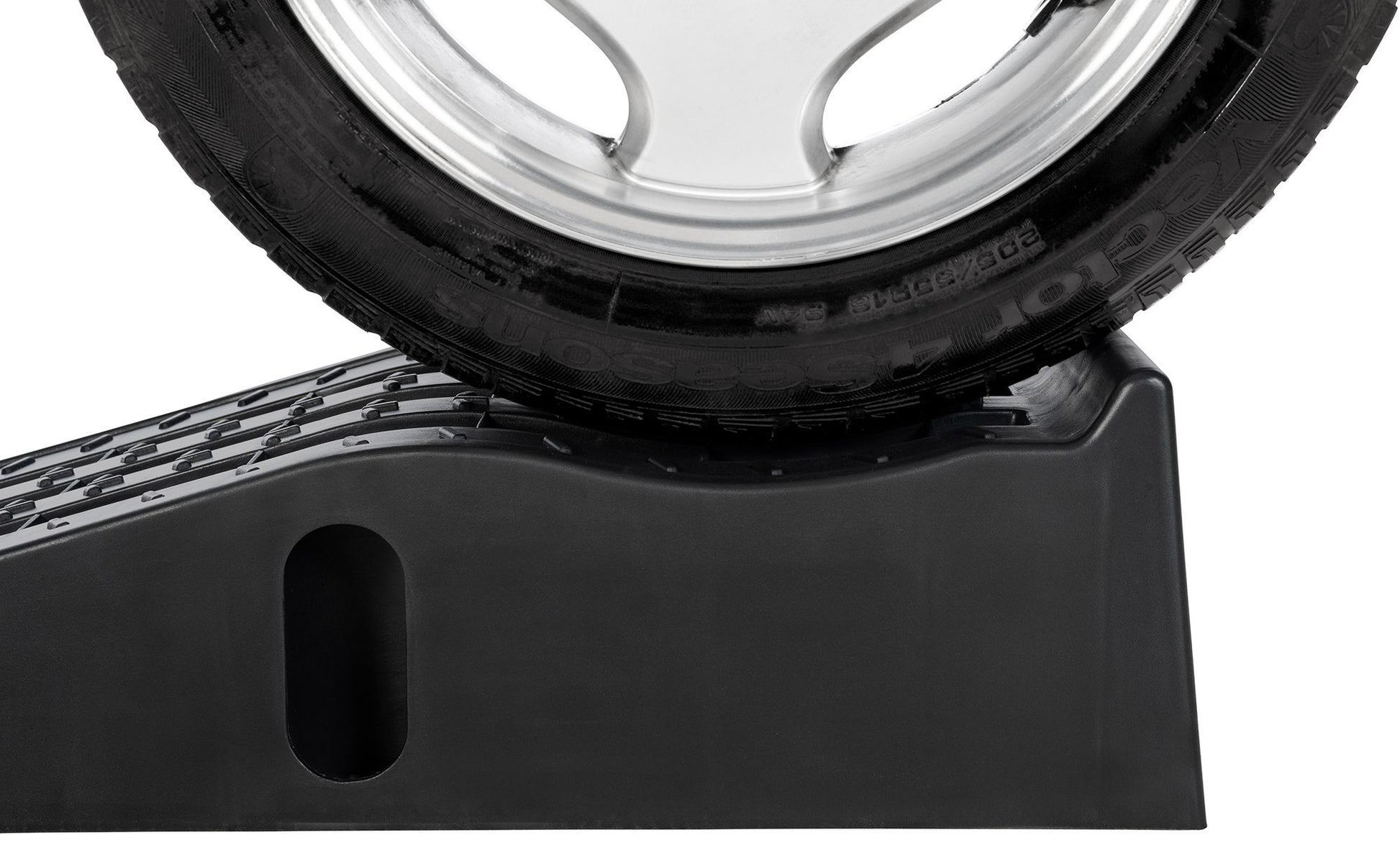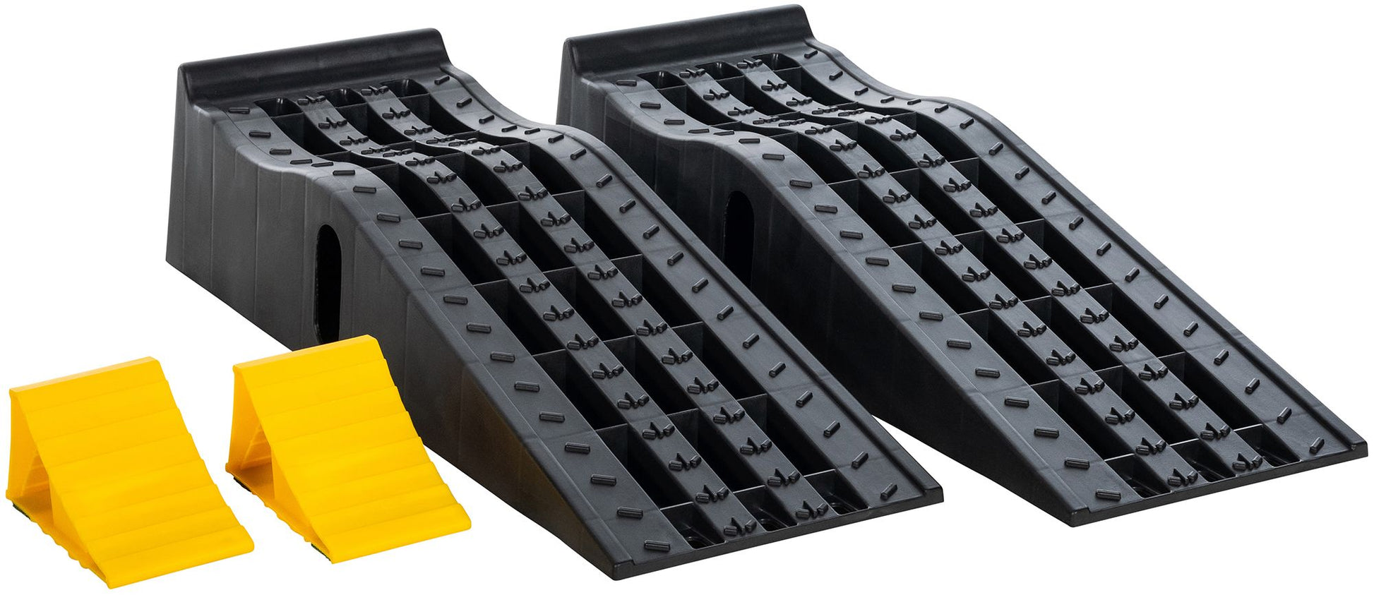 Set 1 umfasst zwei schwarze Auffahrböcke, um eine erhöhte Bodenfreiheit zu ermöglichen, ideal für Autobesitzer, die selbst Reparaturen und Wartungen vornehmen möchten.