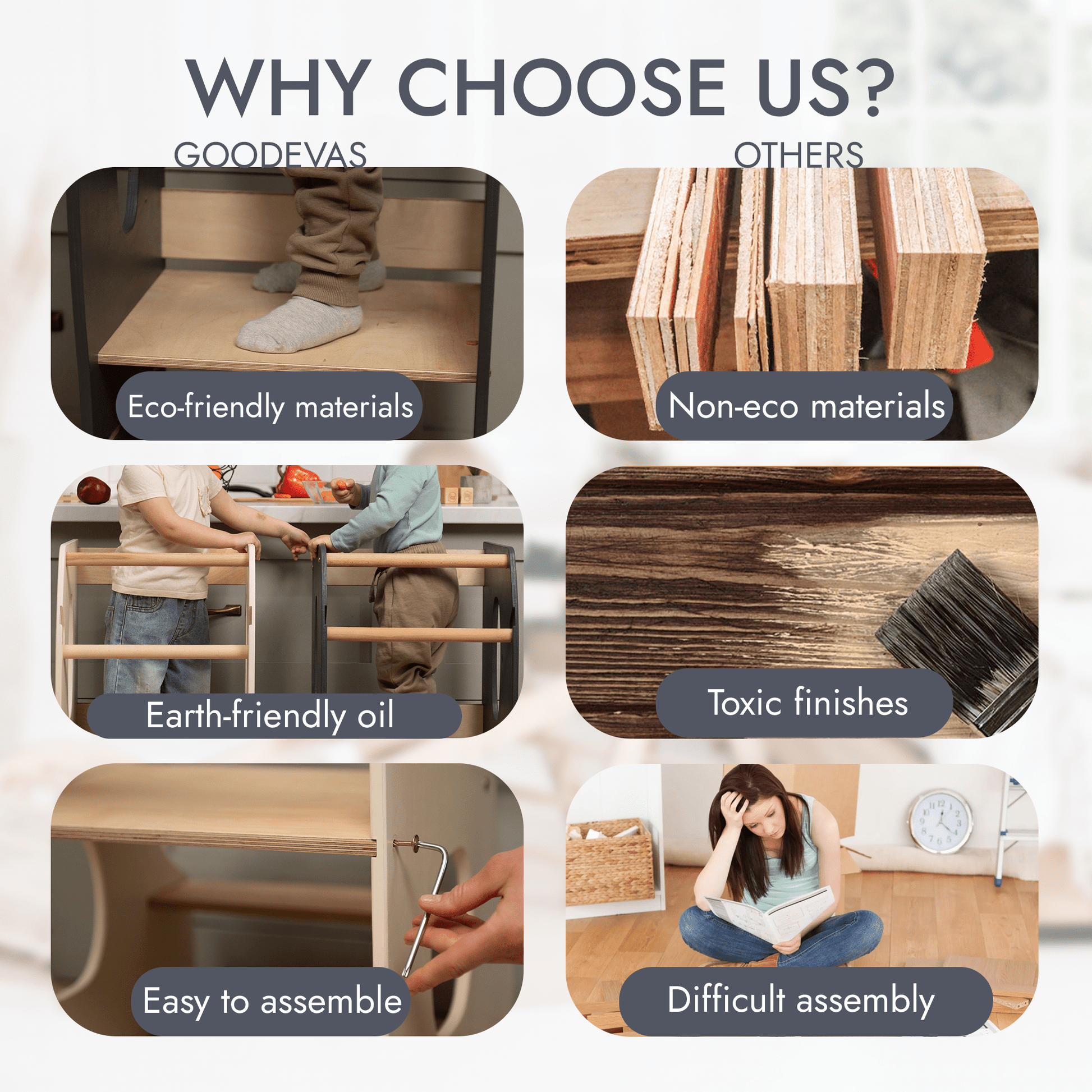 Sicher und stabil: Gefertigt aus robusten Materialien, bietet der Lernturm maximale Stabilität und Schutz. Die solide Konstruktion verhindert ein Wackeln, während seitliche Sicherheitsleisten zusätzliche Sicherheit gewährleisten.