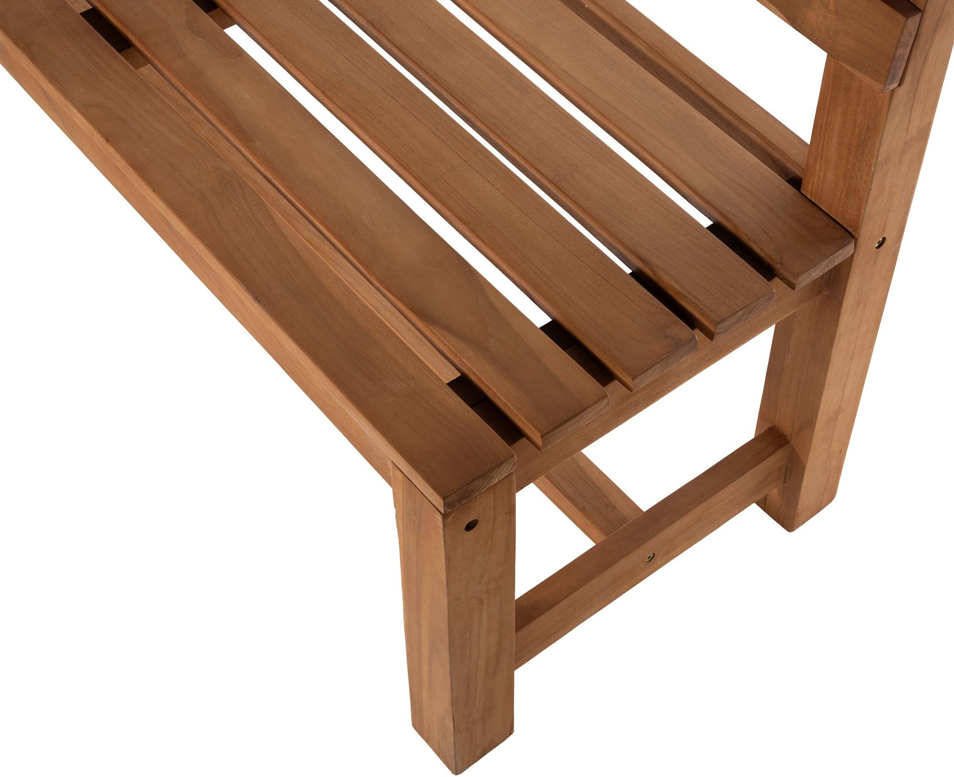 Die Gartenbank sieht mit dem schlichten Äußeren und der goldbraunen Farbe des Teakholzes schick aus und kann mit einer Vielzahl unterschiedlicher Einrichtungsstile kombiniert werden. Im Garten, auf der Terrasse, dem Balkon oder vor dem Haus gibt die Holzbank also ein wunderschönes Bild ab.