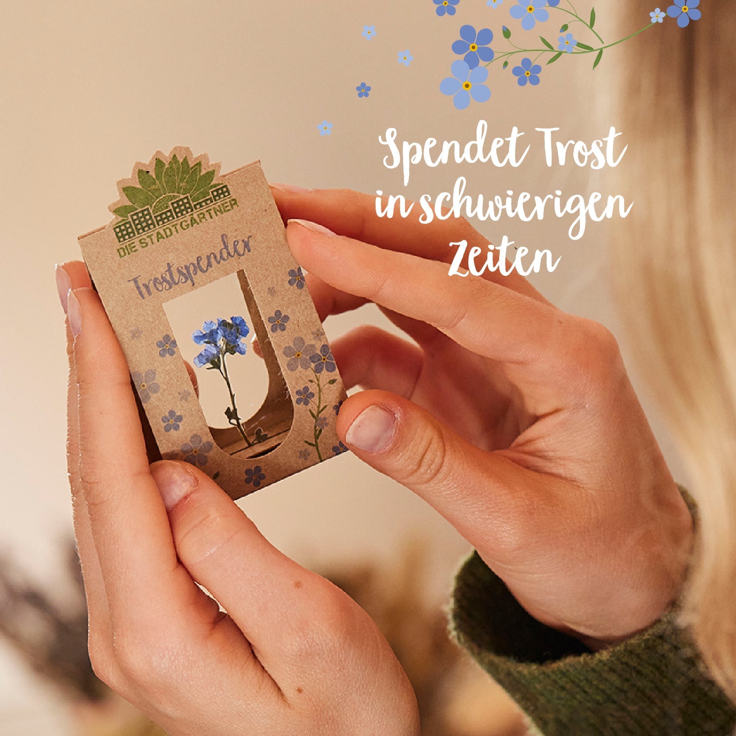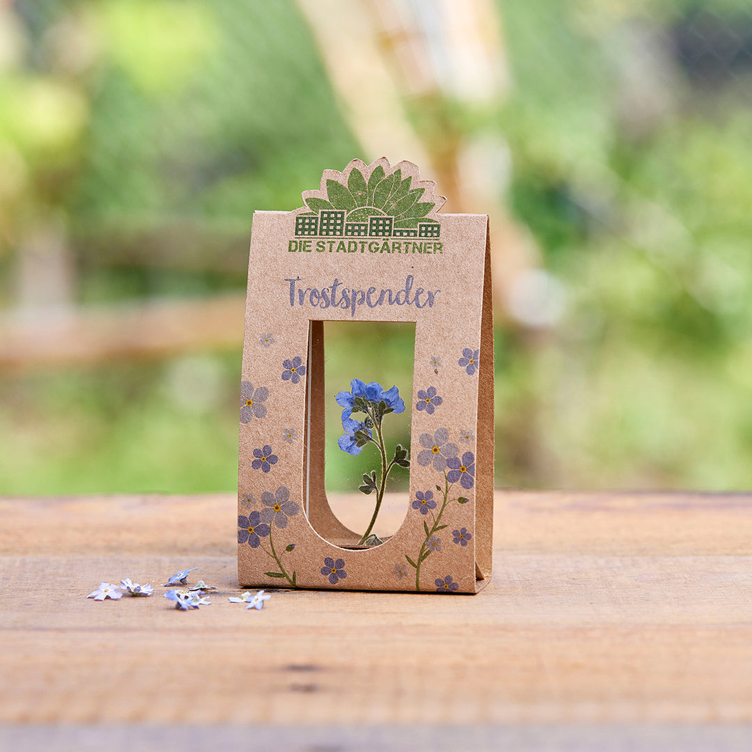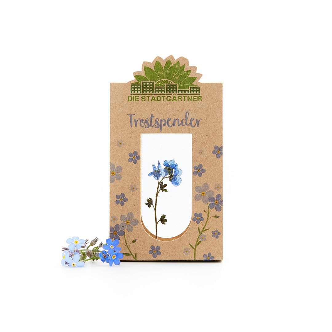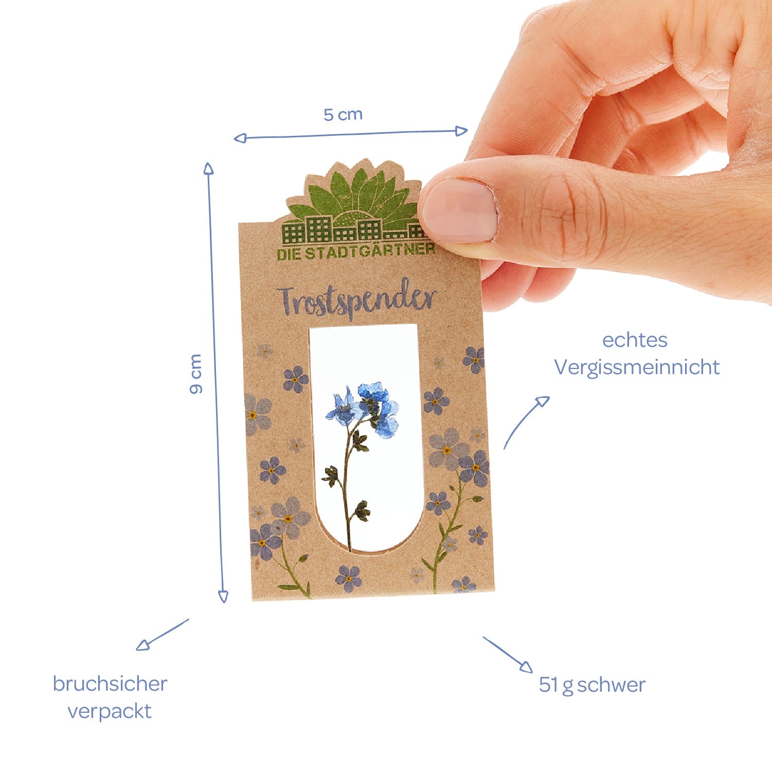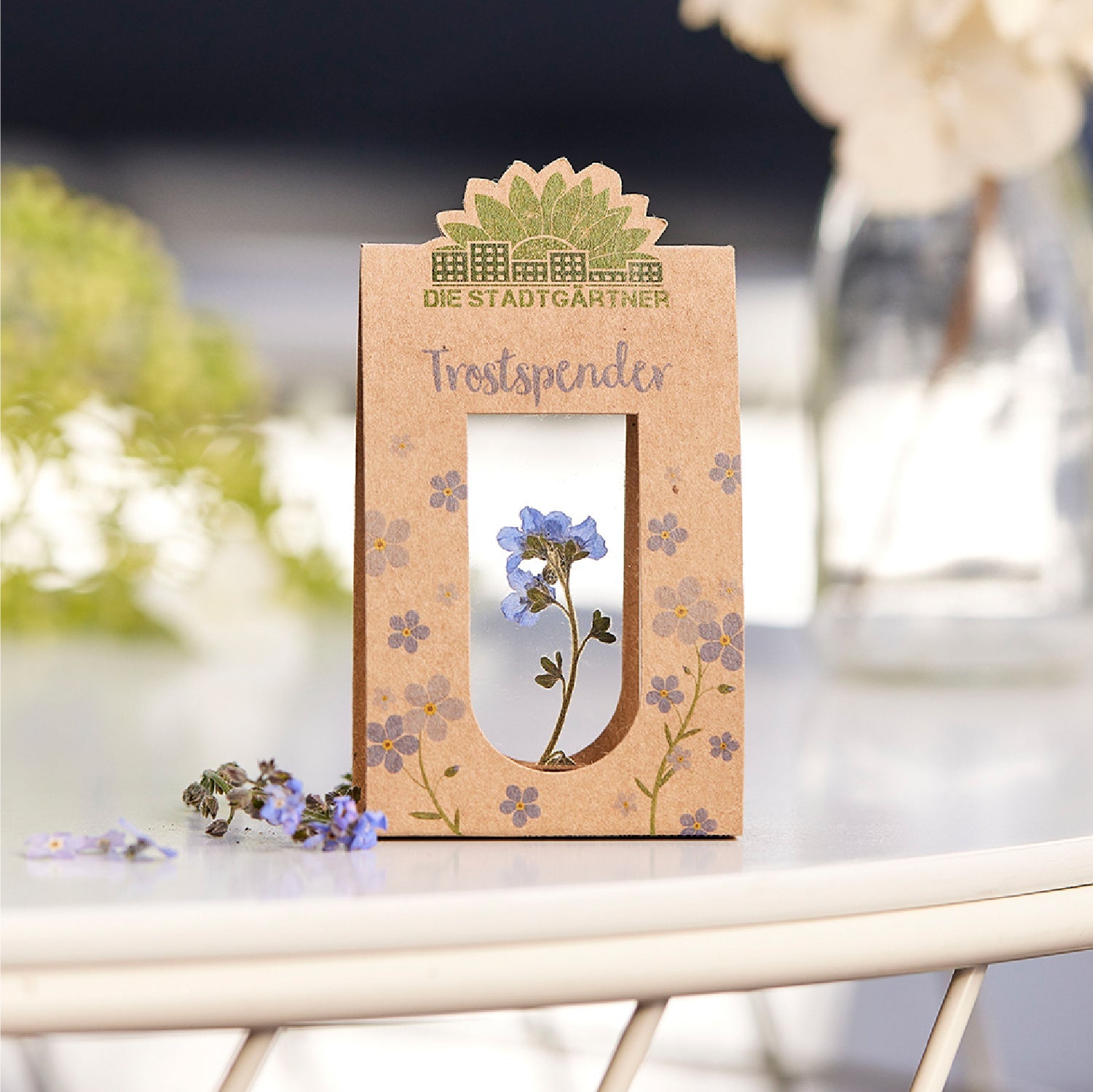 Für den Trostspender haben wir kleine blaue Vergissmeinnicht liebevoll zwischen zwei Glasscheiben konserviert. Die blaue zarte Pflanze trägt ihre Bedeutung schon im Namen. Das Vergissmeinnicht symbolisiert seit jeher Liebe, Treue und Zusammengehörigkeit. Ein schönes Symbol für Momente, in denen Worte manchmal einfach fehlen.